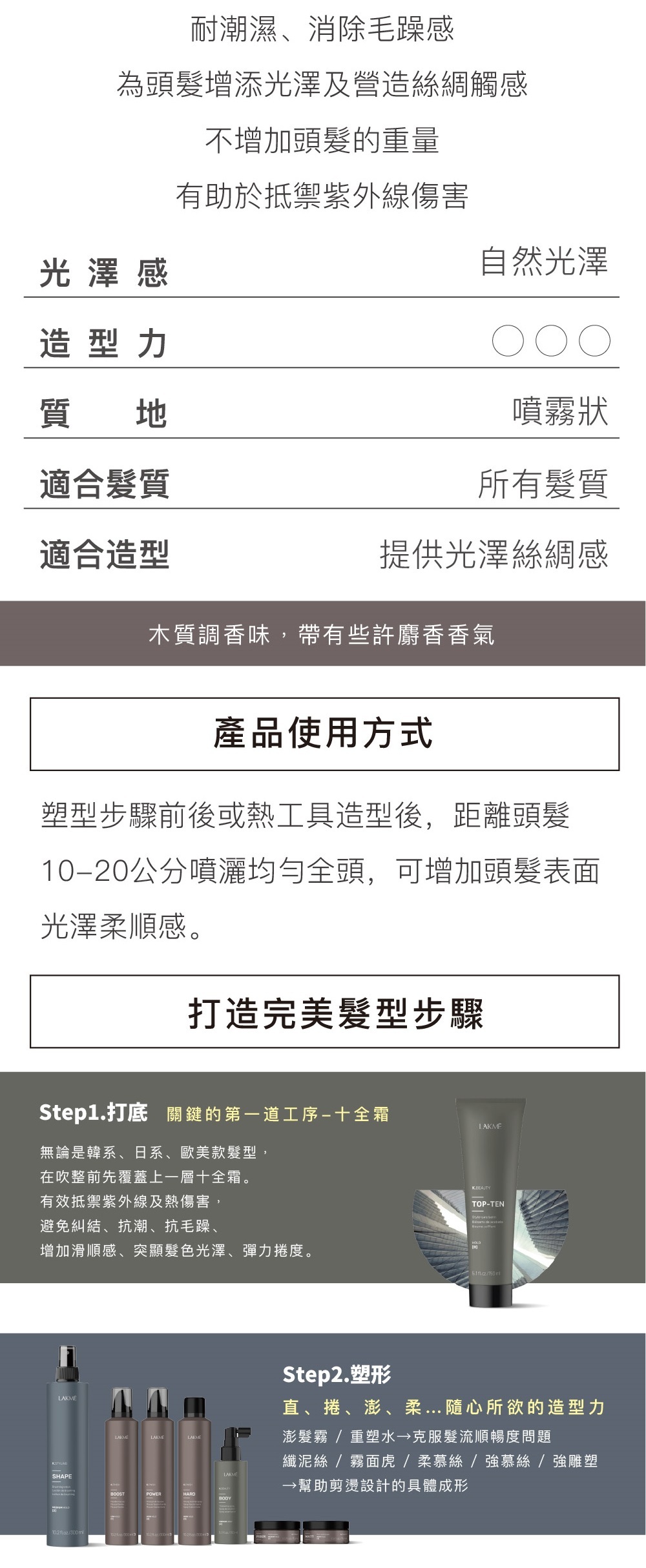 耐潮濕﹐能消除毛躁、絲綢觸感﹐不增加頭髮的重量