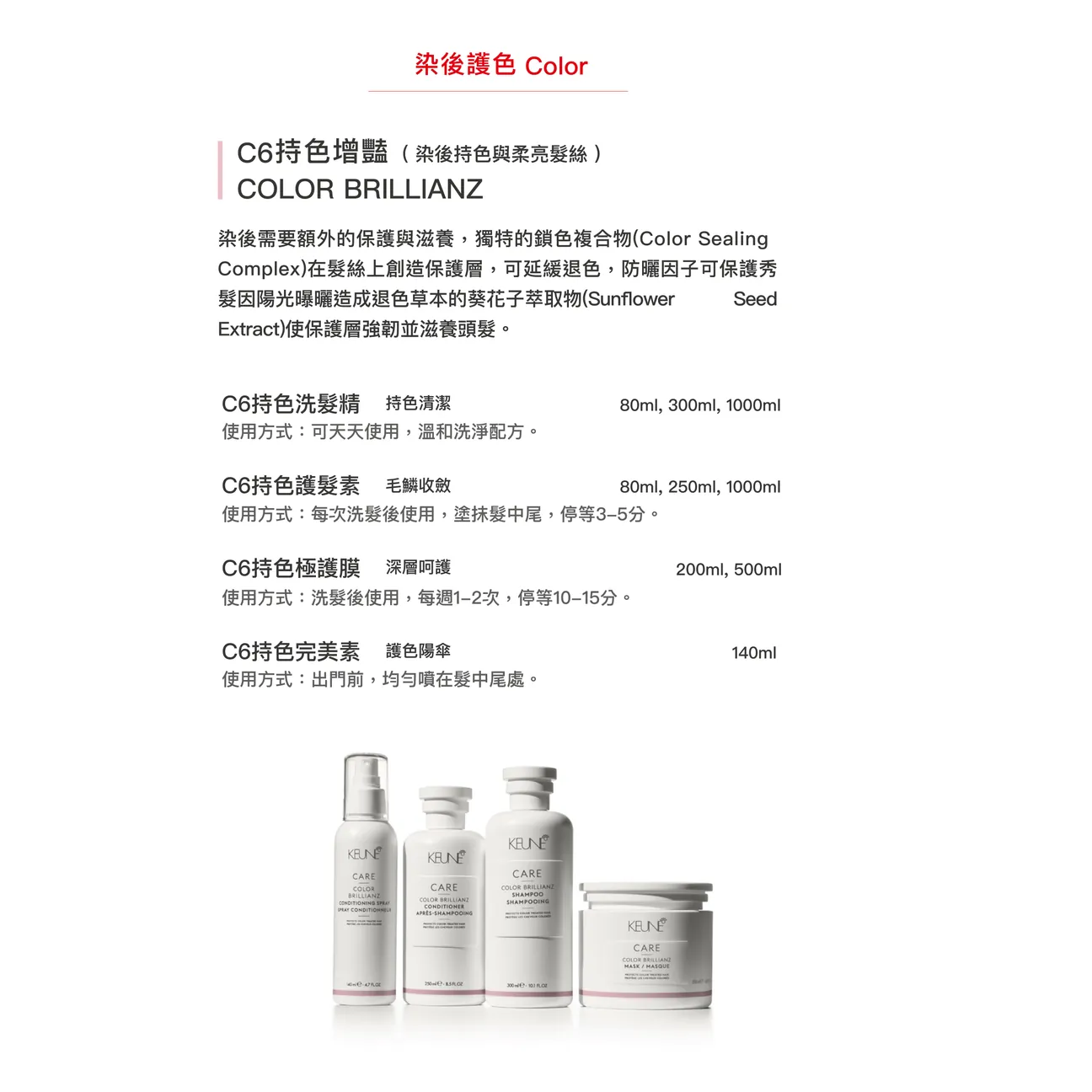 免沖洗噴式,針對染後日常保養開發,鎖色複合物能確保最大的染後護色同時防曬因子可防陽光造成的氧化傷害,深層滋潤成份增加光澤與頭髮柔軟度,是出門前的最佳隨手護。