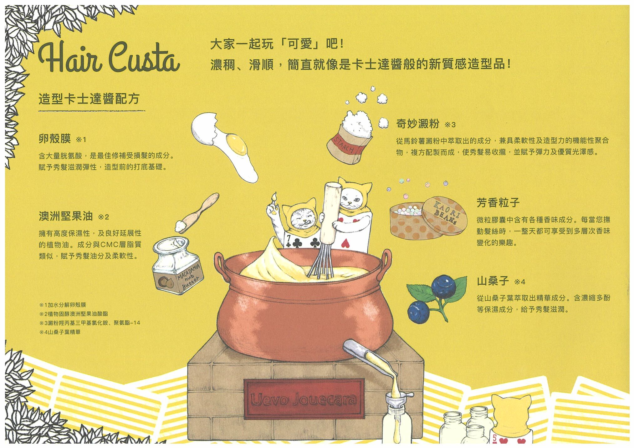 用途:頭髮造型/含卵殼膜及阿拉伯樹膠。如果凍般水潤,帶來「硬線條」的立體造型。