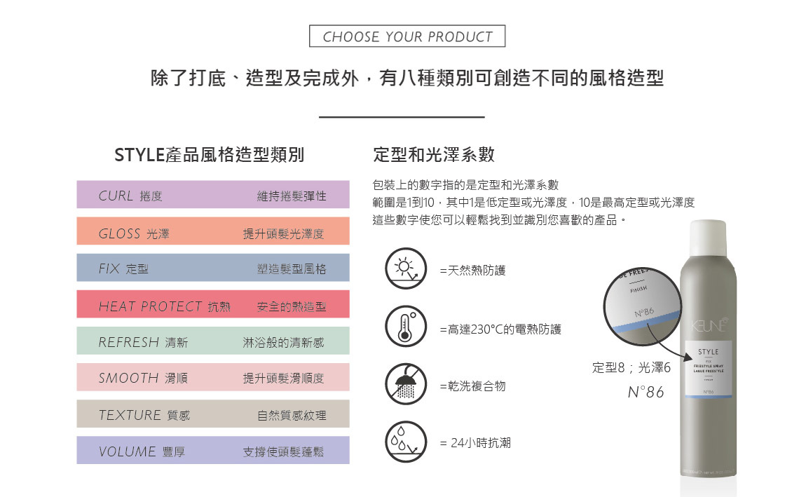 具超強支撐力,能快速且輕鬆創造霧面質感造型,使髮型維持一整天,適合短、中等髮長。