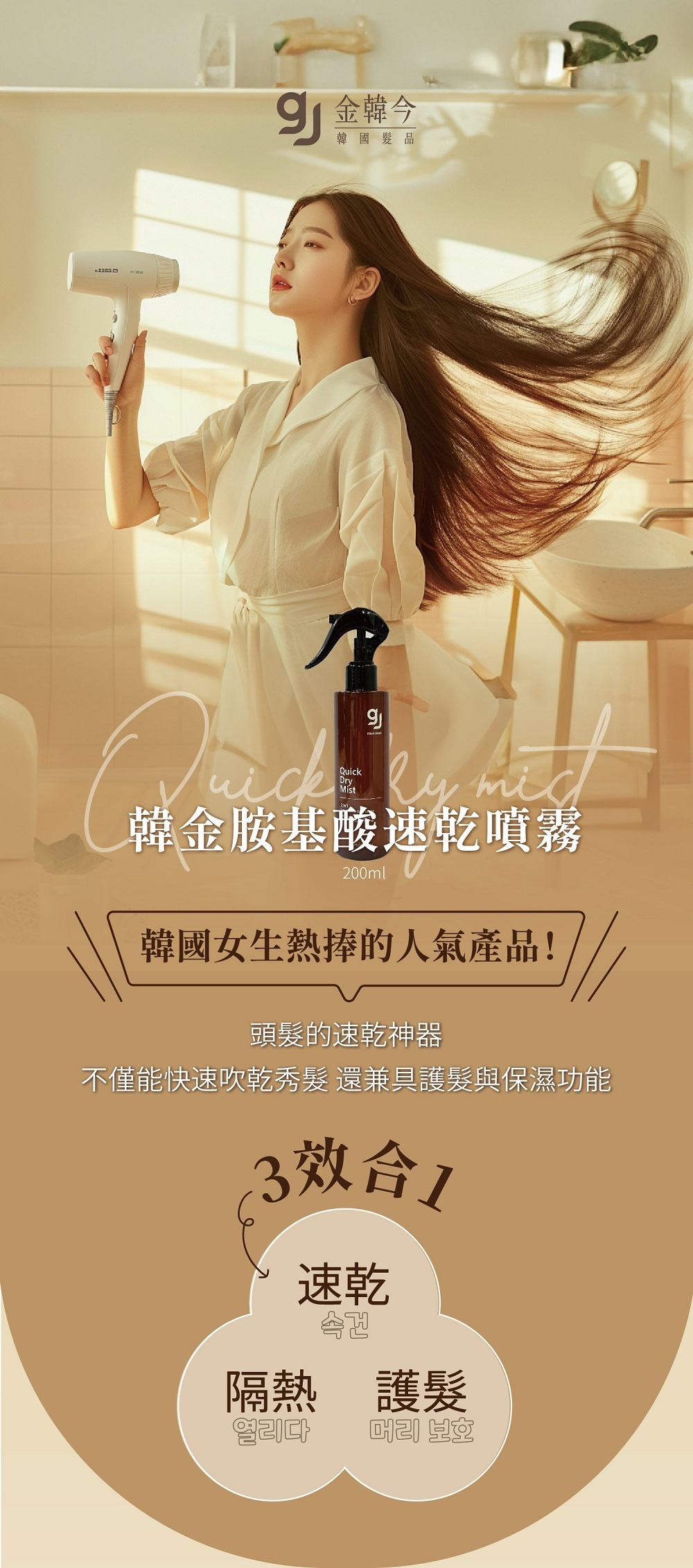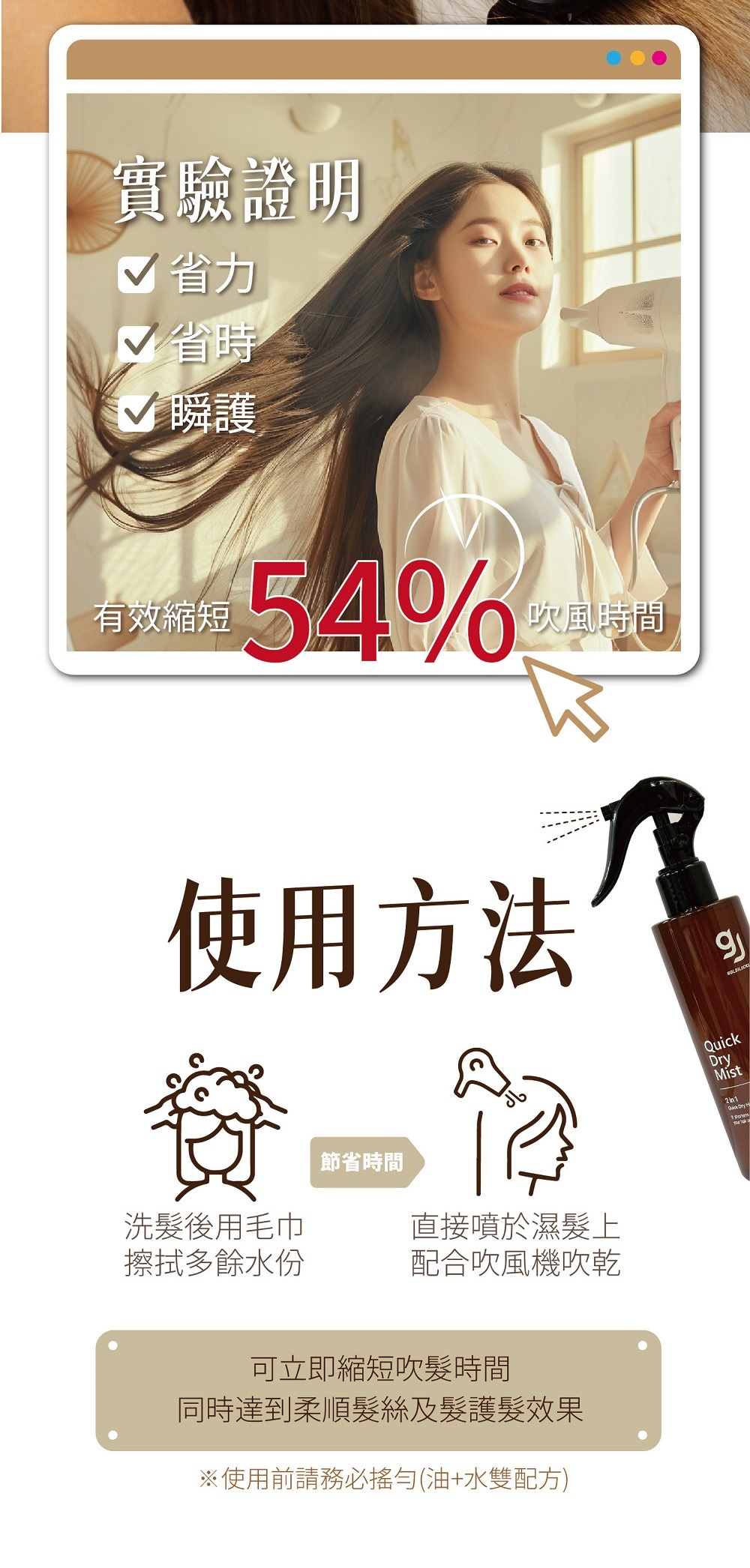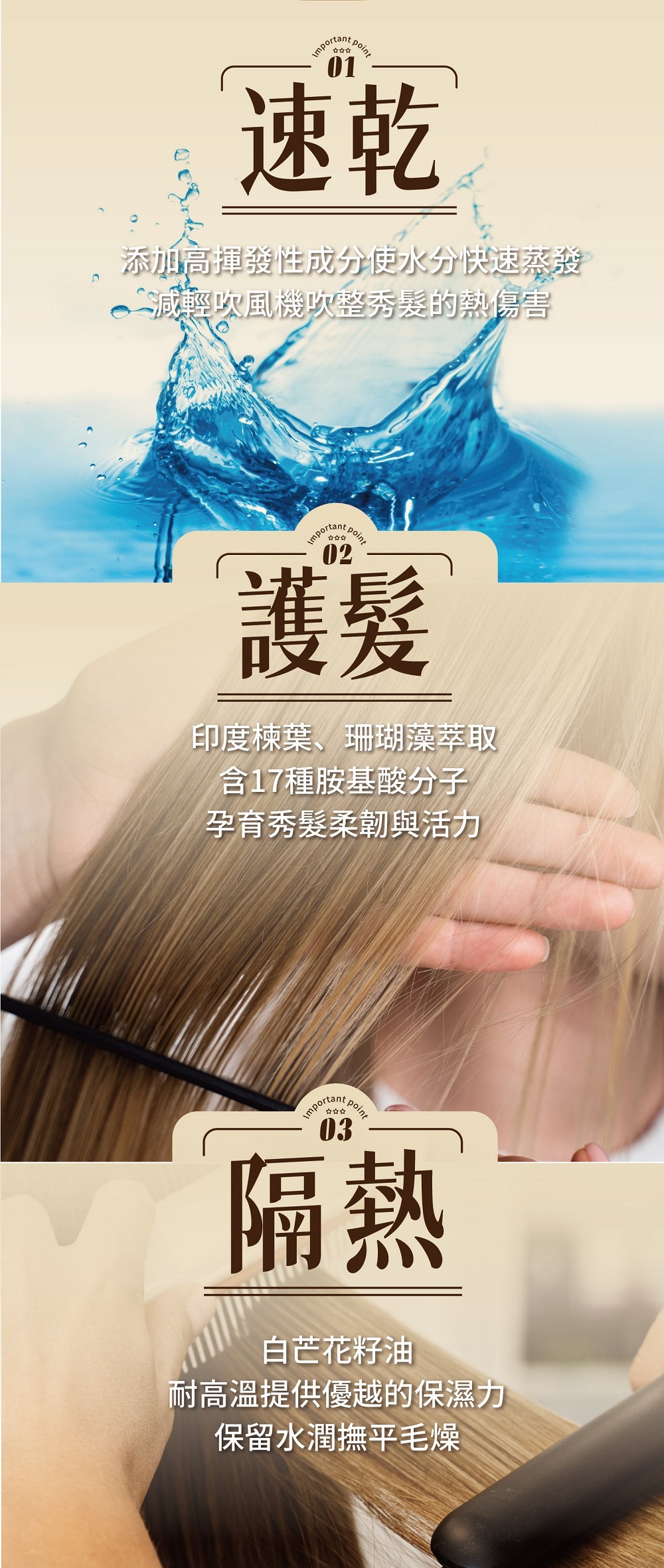 1.速乾│添加高揮發性成分使水分快速蒸發,大幅縮短吹整時間及熱傷害。